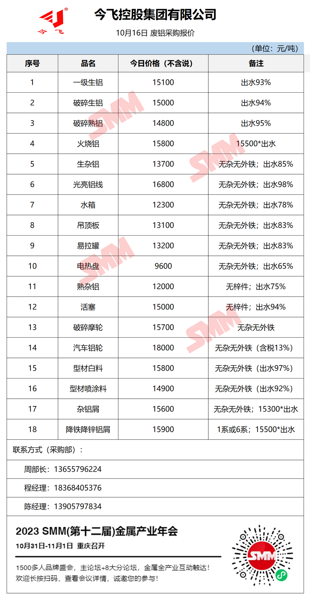 今日今飞集团 废铝采购报价已更新,有货的朋友欢迎联系我们!