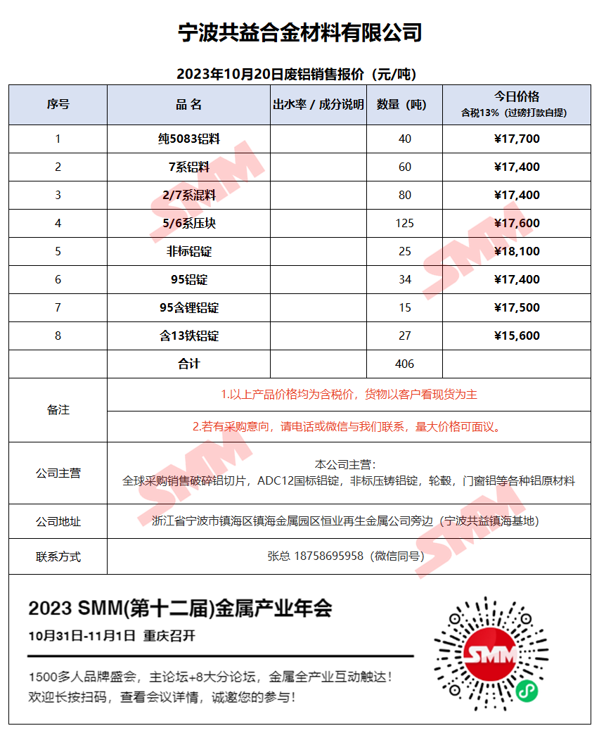 今日宁波共益,废铝销售报价已更新,有采购需求的朋友,欢迎联系我们!