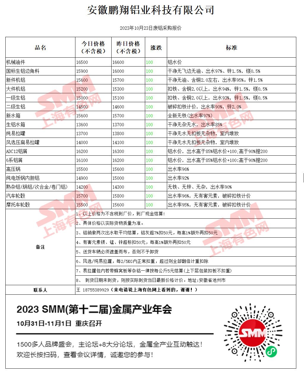 10月23日安徽鹏翔 废铝采购报价