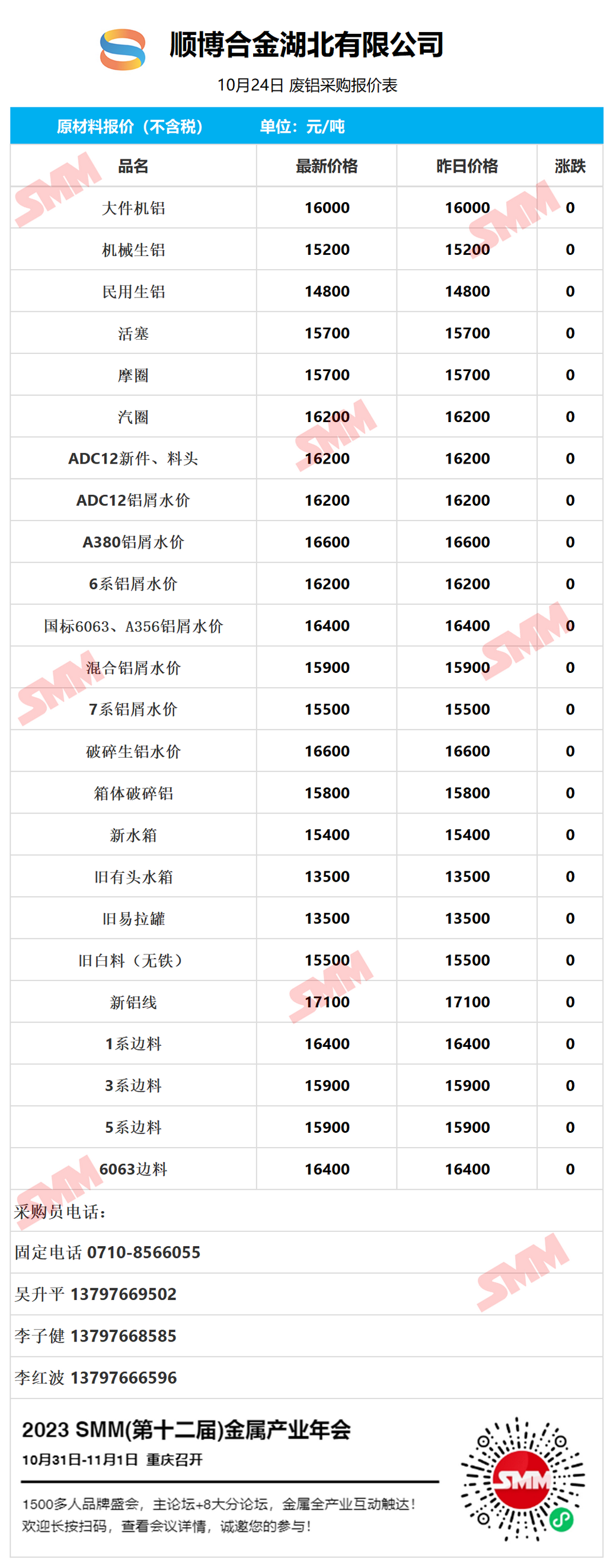 今日顺博合金湖北废铝采购报价已更新,有货的朋友欢迎联系我们!