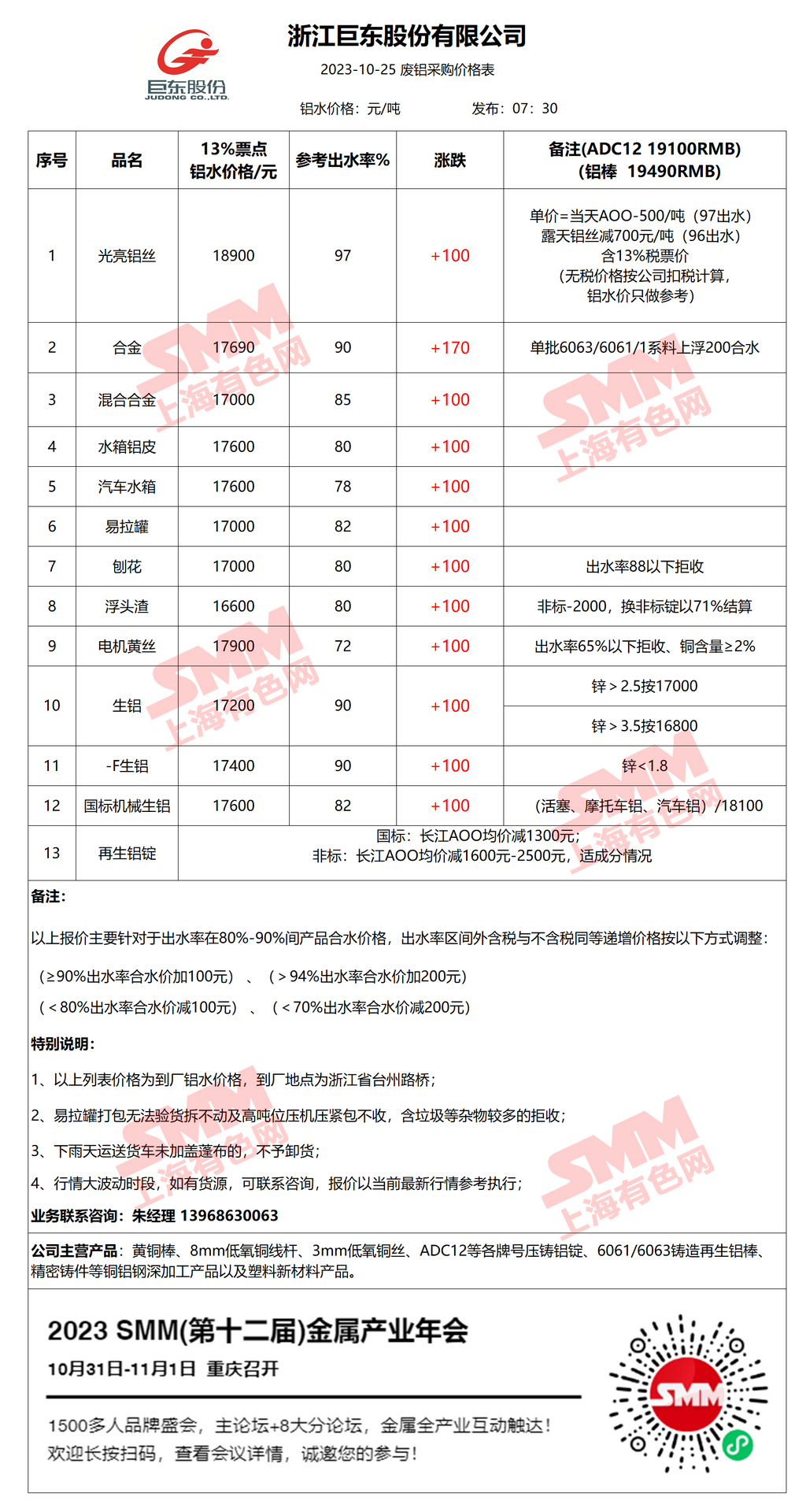 今日浙江巨东 废铝采购报价已更新,有货的朋友欢迎联系我们!