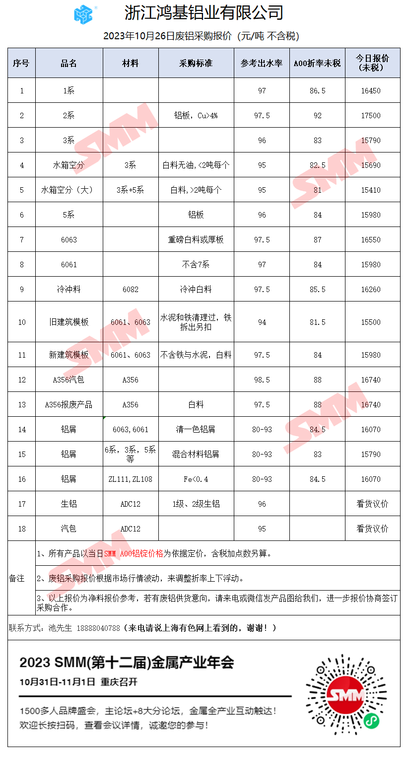 浙江鸿基铝业 今日废铝采购报价已更新,有货的欢迎来电咨询。