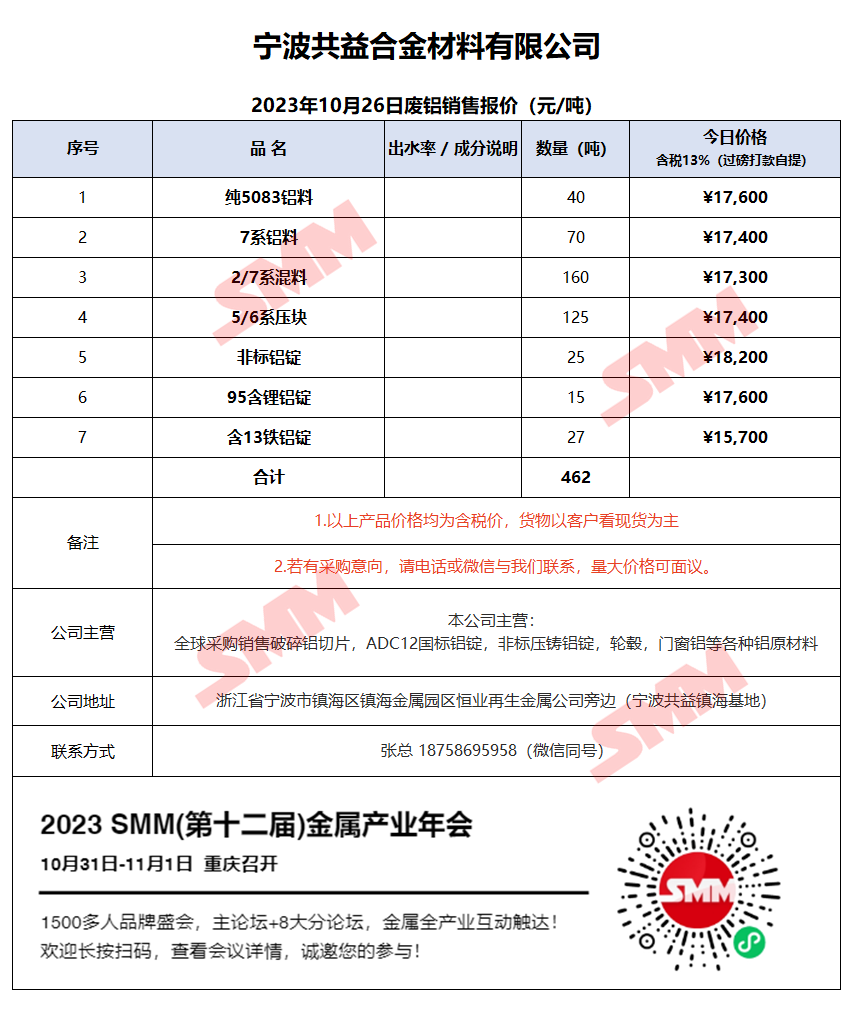 今日宁波共益,废铝销售报价已更新,有采购需求的朋友,欢迎联系我们!