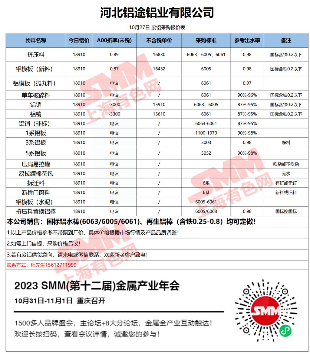 今日河北铝途铝业有限公司 废铝采购报价已更新,有货的朋友欢迎联系我们!