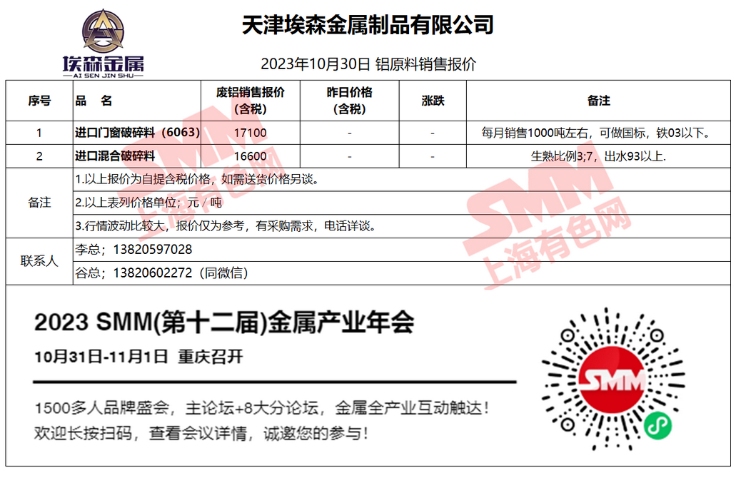 10月30日天津埃森 废铝销售报价