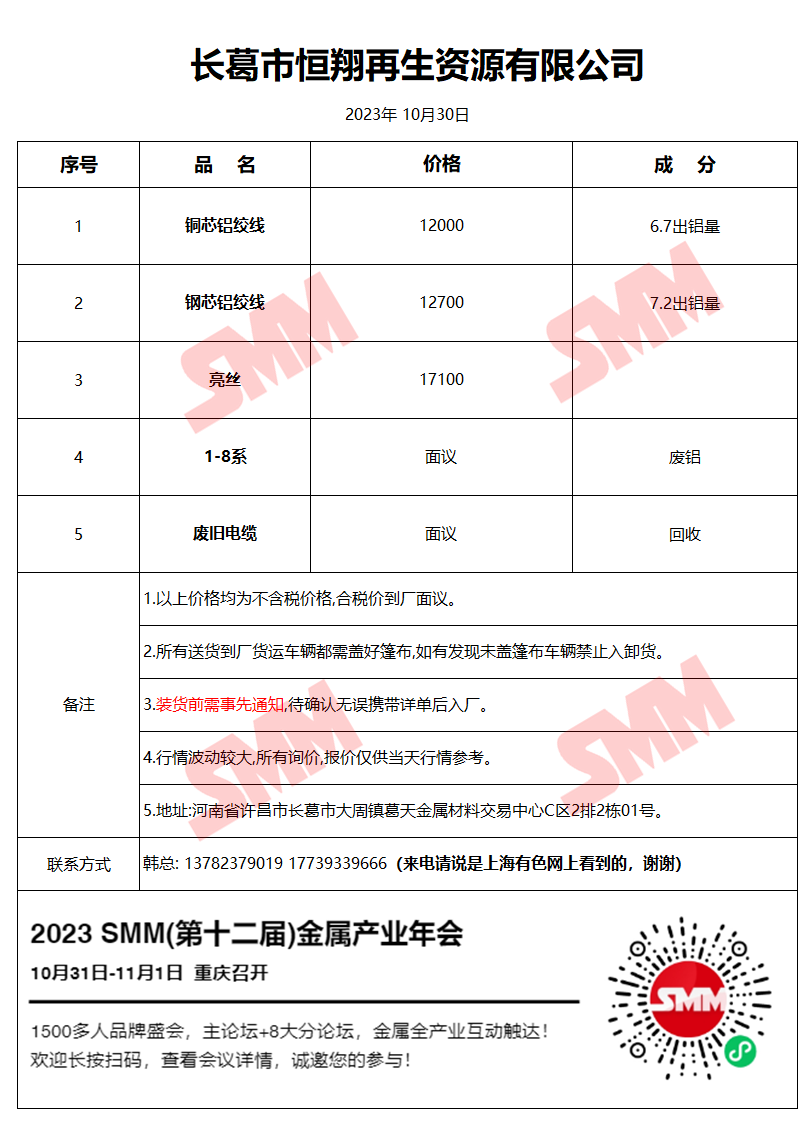 10月30日长葛恒翔 废铝采购报价