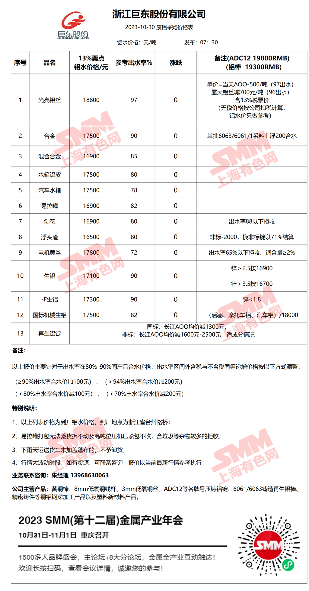 今日浙江巨东 废铝采购报价已更新,有货的朋友欢迎联系我们!