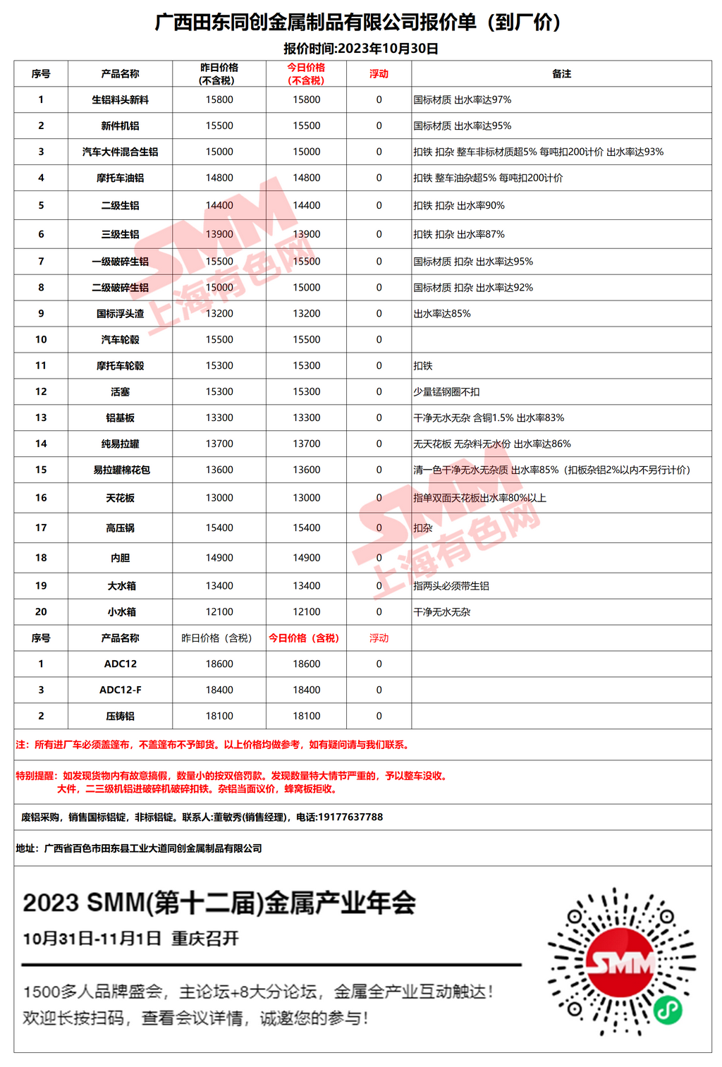 今日广西田东同创金属制品有限公司 废铝采购报价已更新,有货的朋友欢迎联系我们!