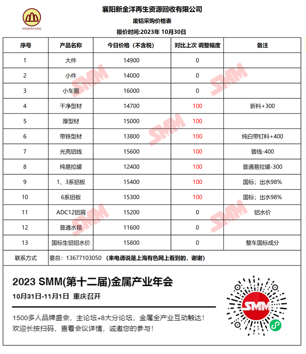 10月30日襄阳新金洋 废铝采购报价