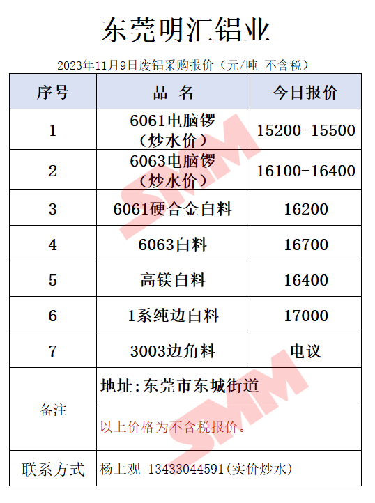 今日东莞明汇铝业 废铝采购报价已更新,有货的朋友欢迎联系我们!