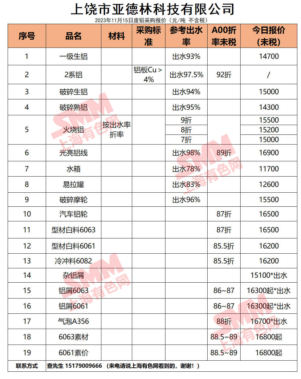 上饶市亚德林今日主要废铝料收购价目表已更新,有货的朋友欢迎联系我们!