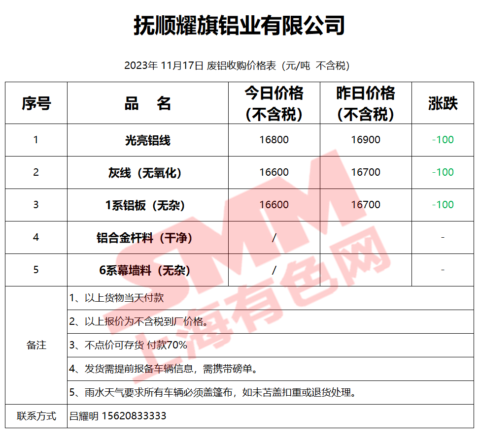 11月17日抚顺耀旗 废铝采购报价