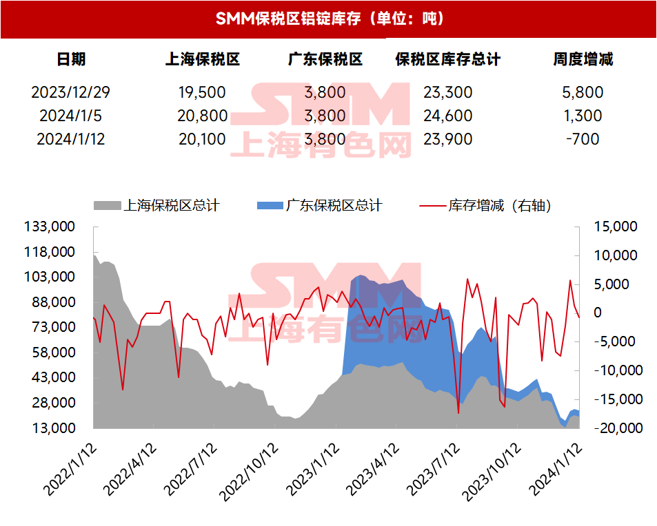 2024年1月12日电解铝保税区库存:保税区库存小幅去库【SMM数据】