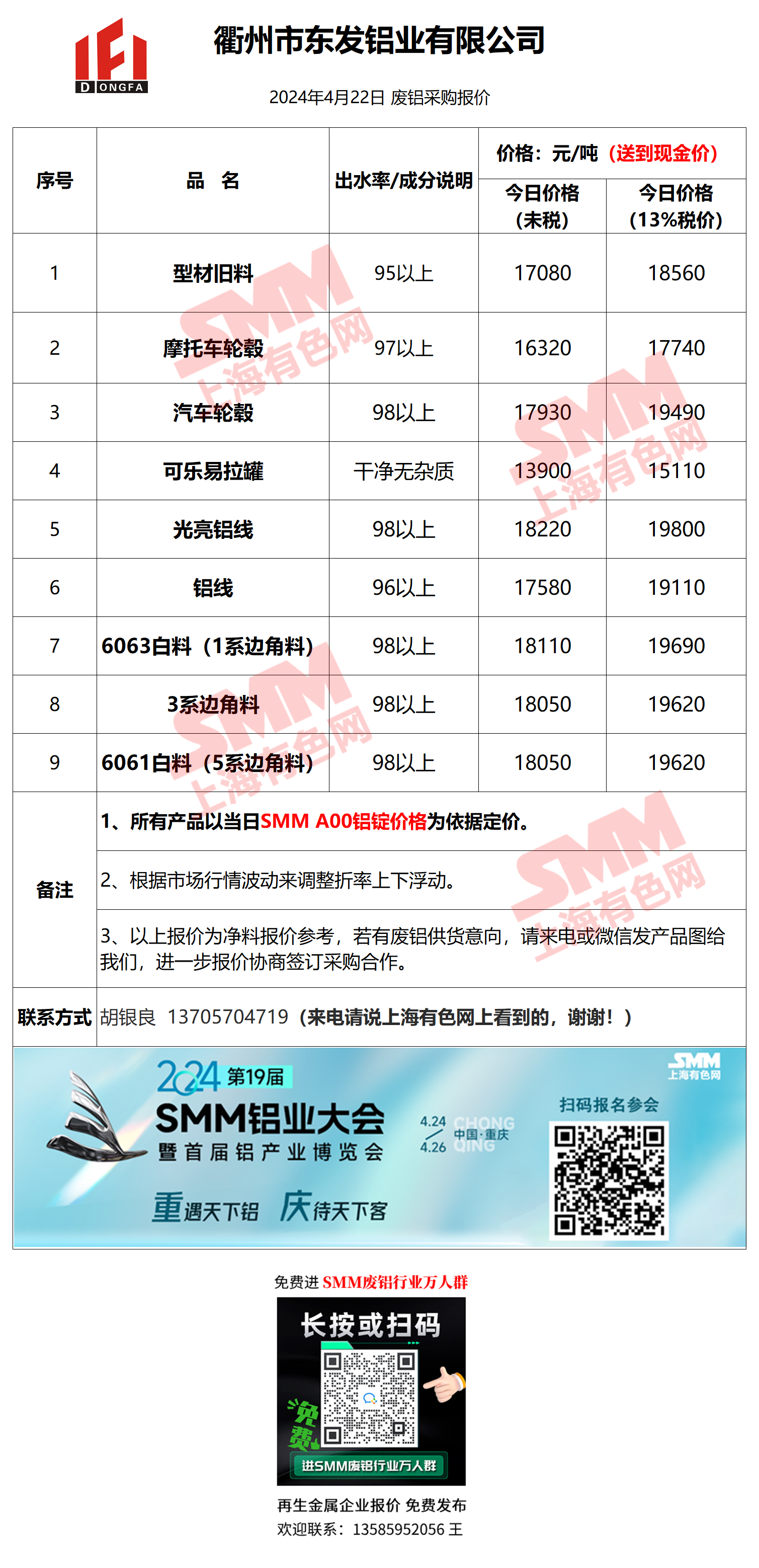今日衢州东发 废铝采购报价已更新,有货的朋友欢迎联系我们!