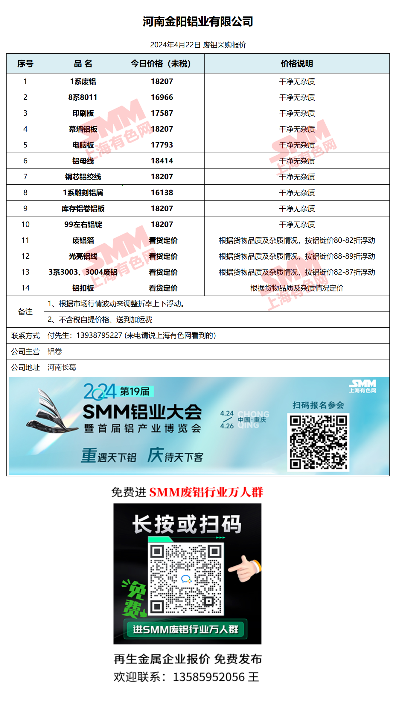4月22日河南金阳铝业 废铝采购报价