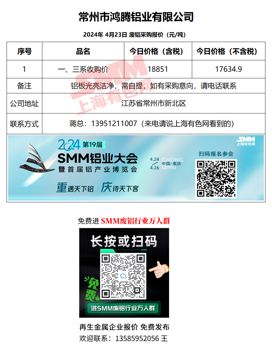 4月23日鸿腾铝业 废铝采购报价