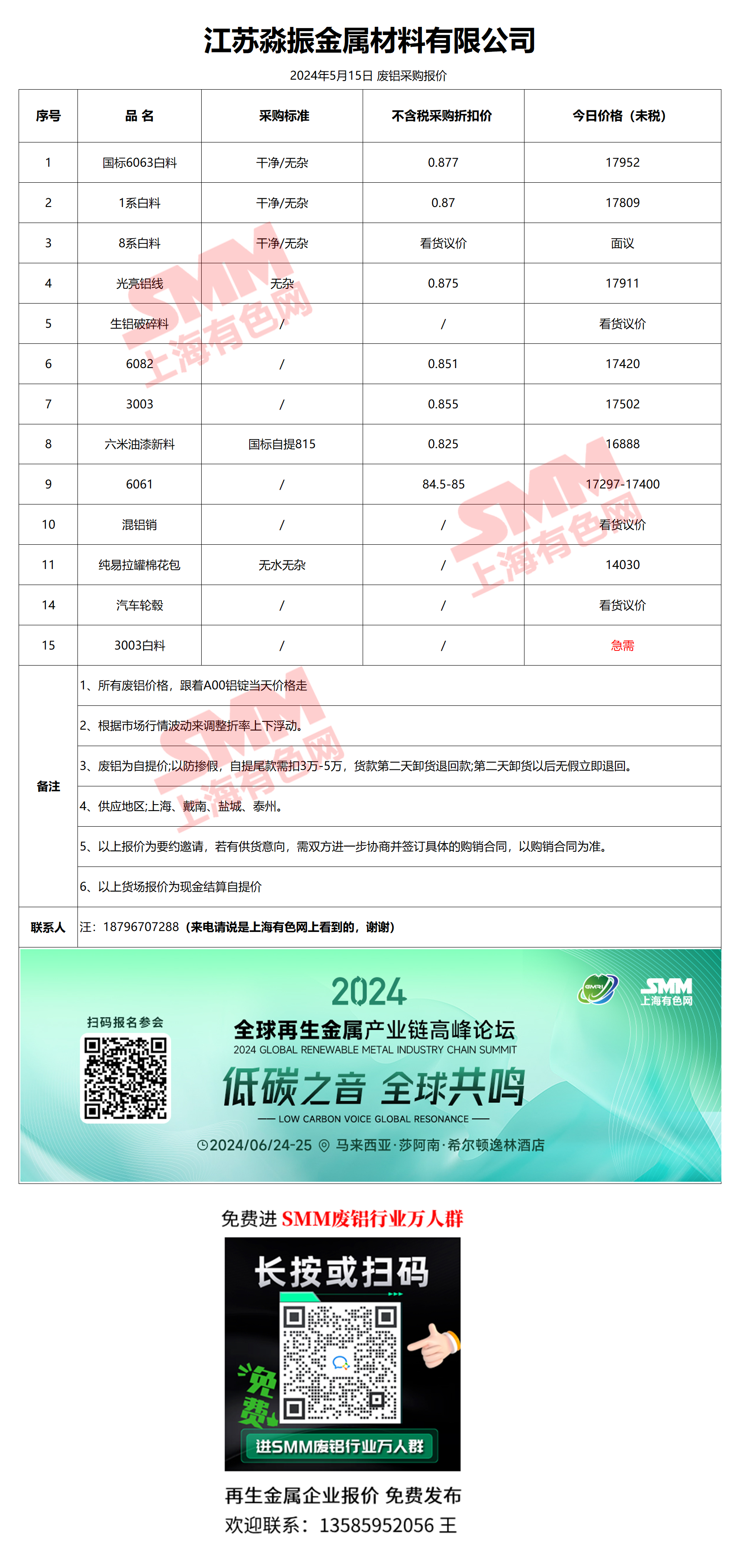 5月15日江苏淼振 废铝采购报价