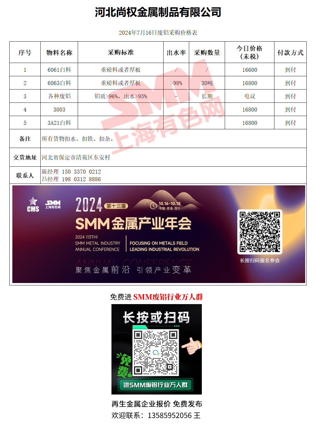7月16日河北尚权 废铝采购报价