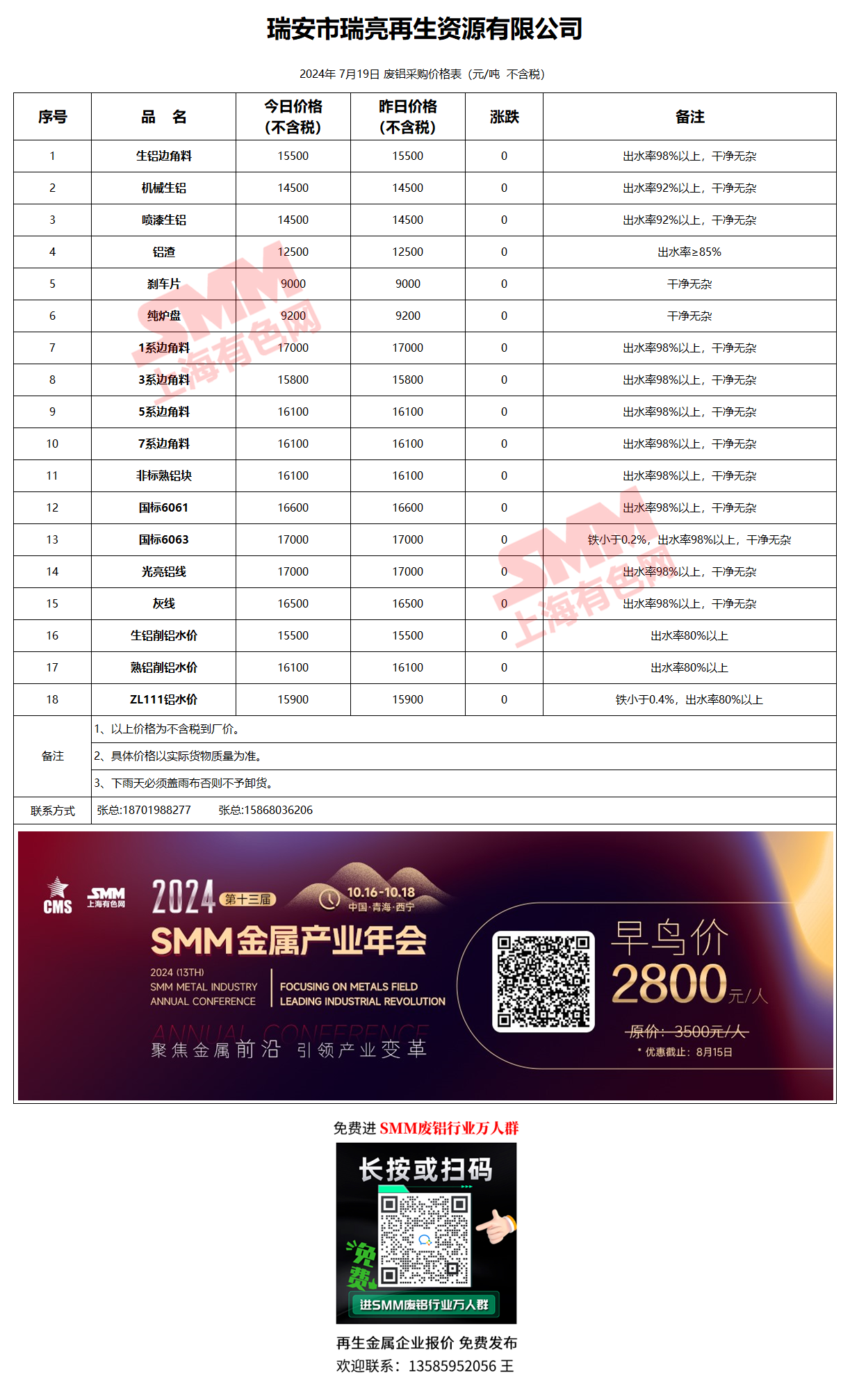 7月19日瑞亮再生 废铝采购报价
