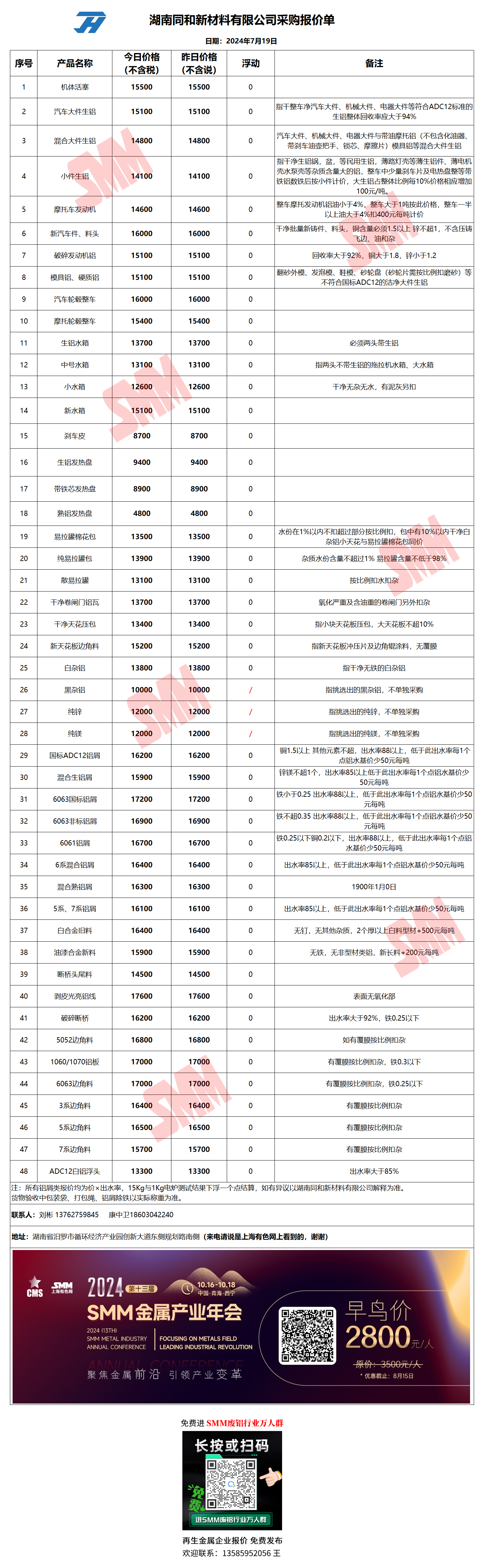 7月19日湖南同和 废铝采购报价
