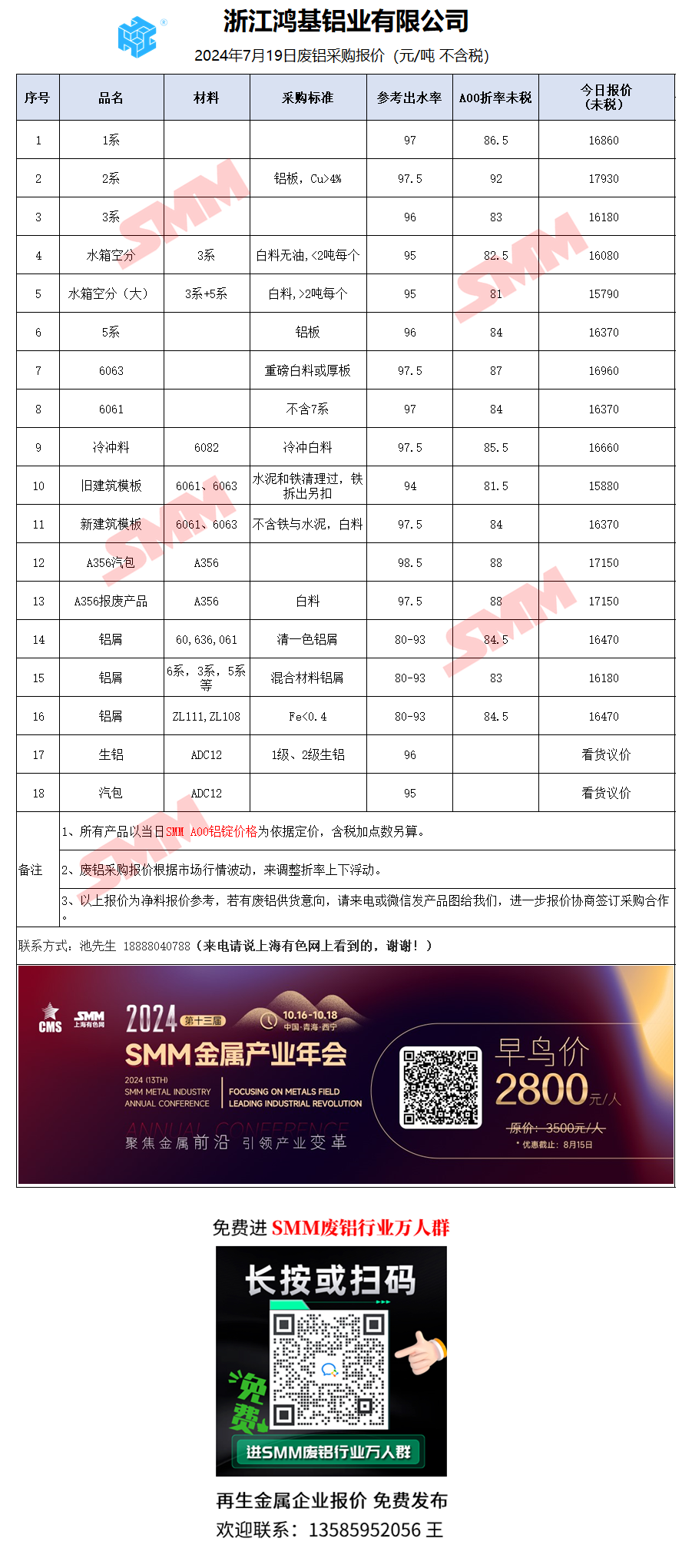 今日浙江鸿基铝业 废铝采购报价已更新,有货的朋友欢迎联系我们!