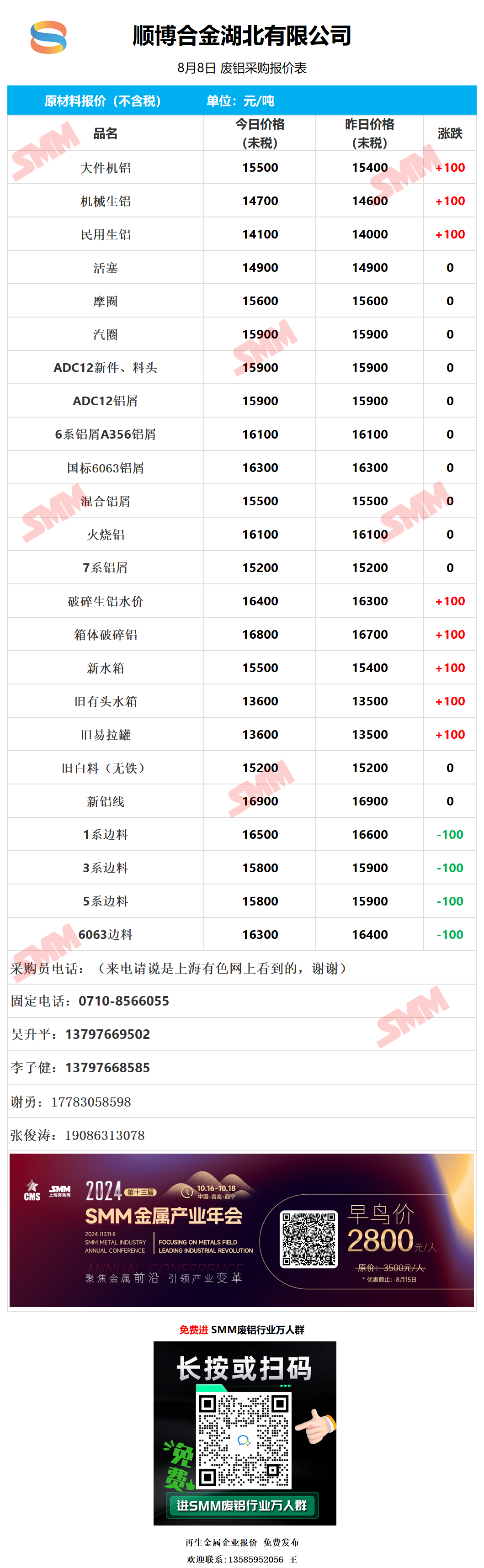 8月8日顺博合金湖北 废铝采购报价