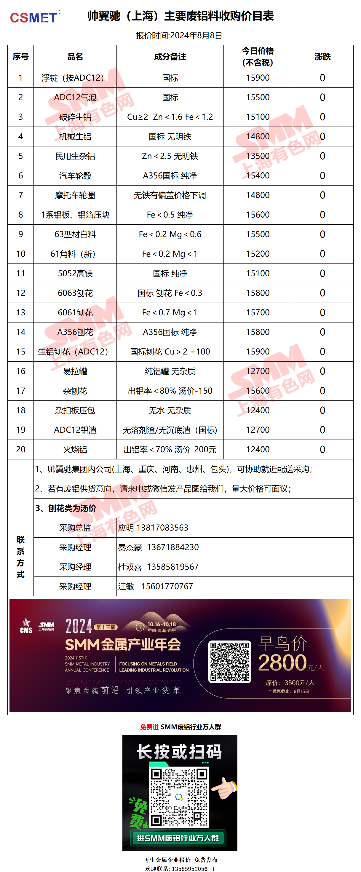 8月8日帅翼驰(上海) 废铝采购报价