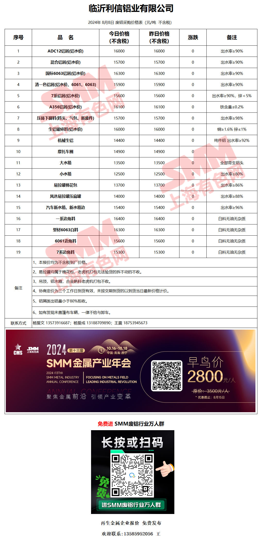 今日临沂利信 废铝采购报价已更新,有货的朋友欢迎联系我们!