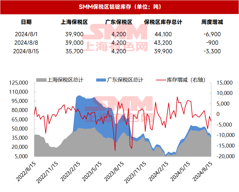 SMM统计: 8月15日,SMM统计上海保税区电解铝库存为35,700吨,广东保税区库存4,200吨,总计库存39,900吨,周度环比减少3,300吨。
