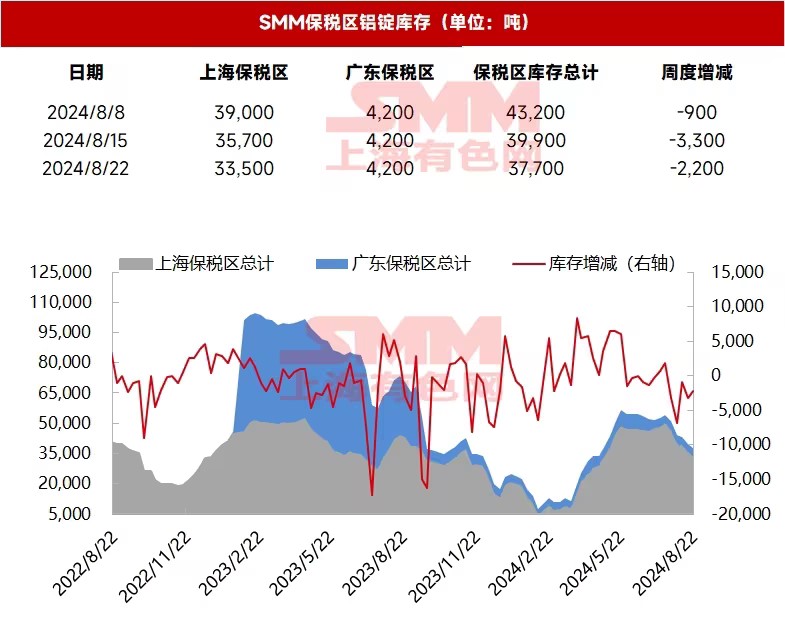 SMM统计: 8月22日,SMM统计上海保税区电解铝库存为33,500吨,广东保税区库存4,200吨,总计库存37,700吨,周度环比减少2,200吨。