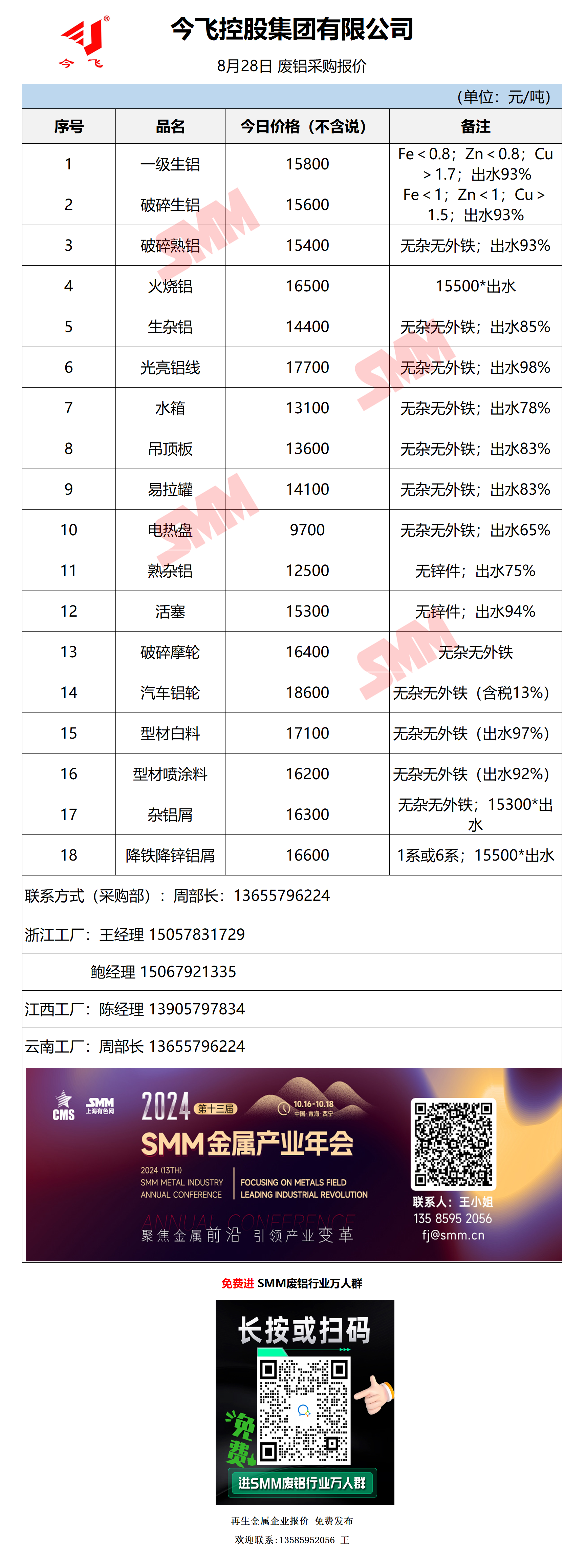 8月28日今飞集团 废铝采购报价
