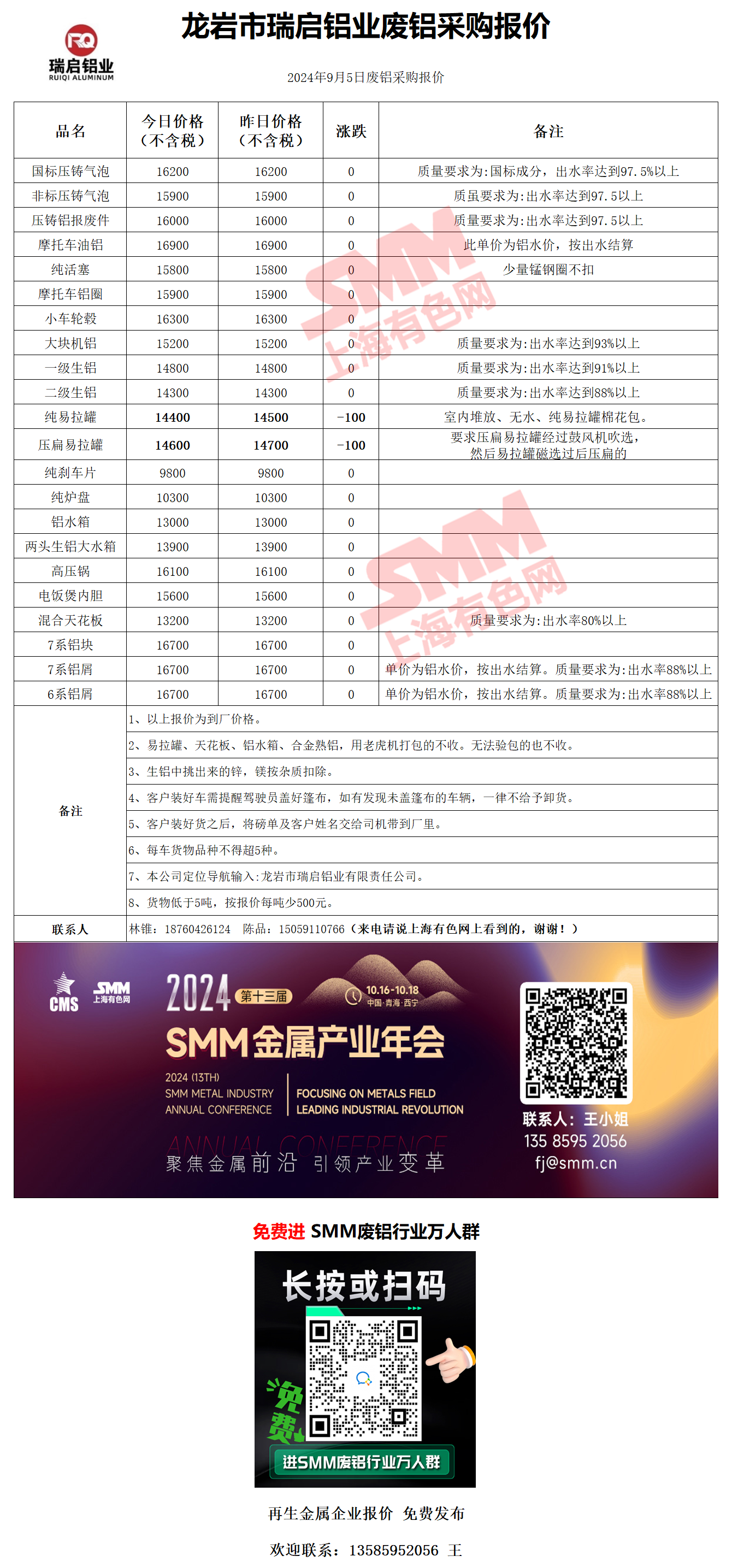 9月5日龙岩瑞启 废铝采购报价