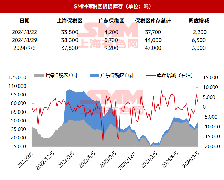9月5日,SMM统计上海保税区电解铝库存为37,800吨,广东保税区库存9,200吨,总计库存47,000吨,周度环比增加3000吨。