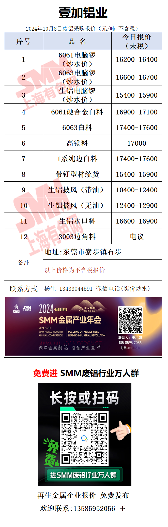 10月8日壹加铝业 废铝采购报价