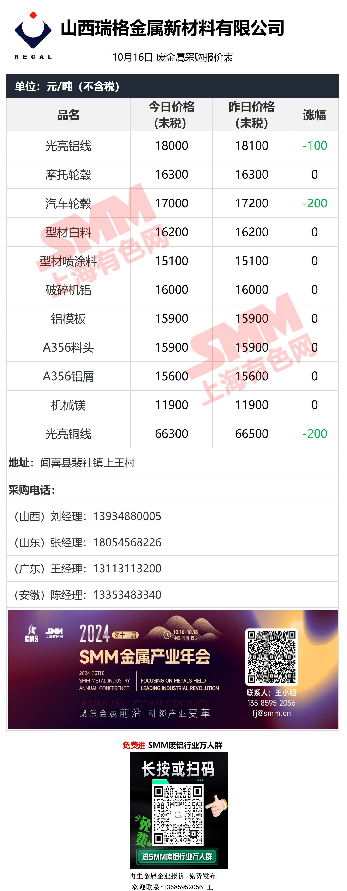 今日瑞格金属 废铝采购报价已更新,有货的朋友欢迎联系我们!