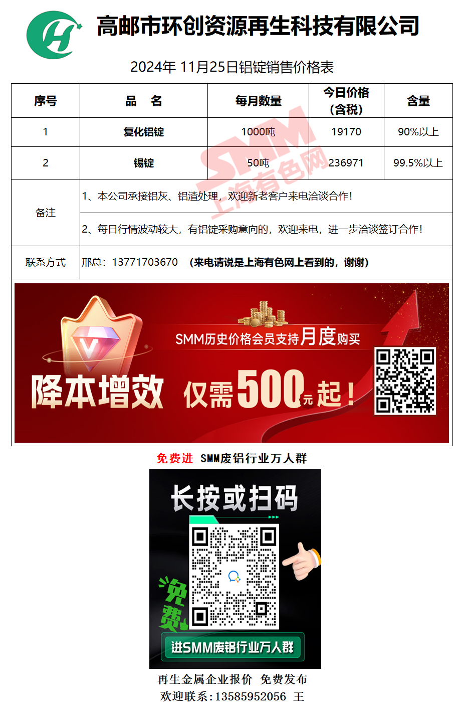 今日高邮环创铝业 废铝销售报价已更新,有货的朋友欢迎联系我们!