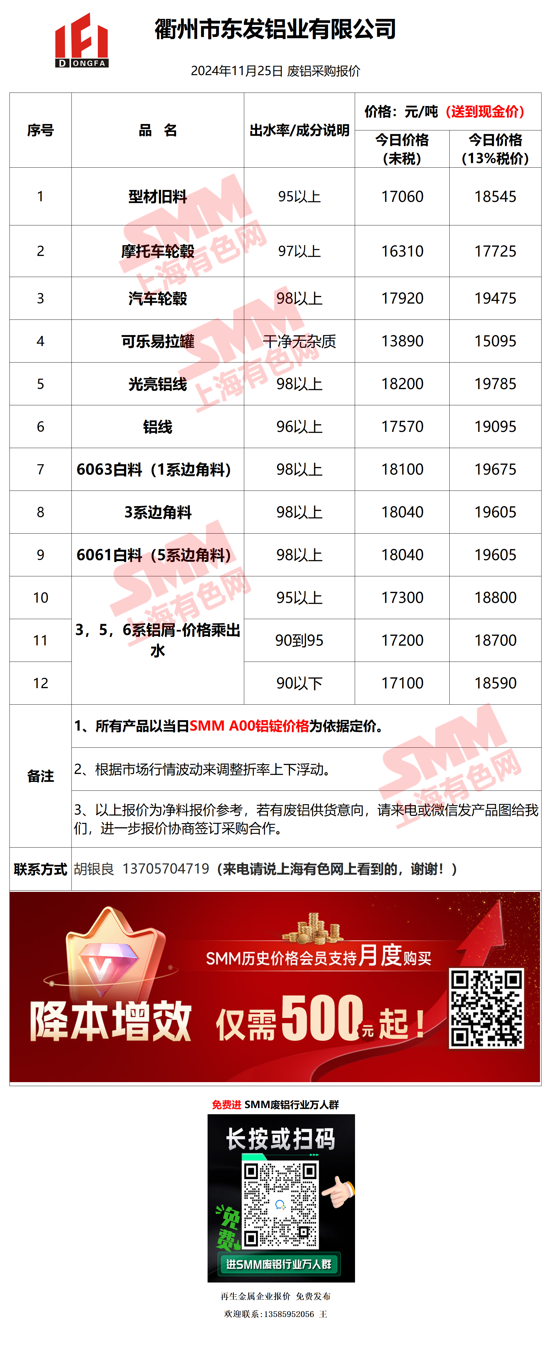 今日衢州东发 废铝采购报价已更新,有货的朋友欢迎联系我们!