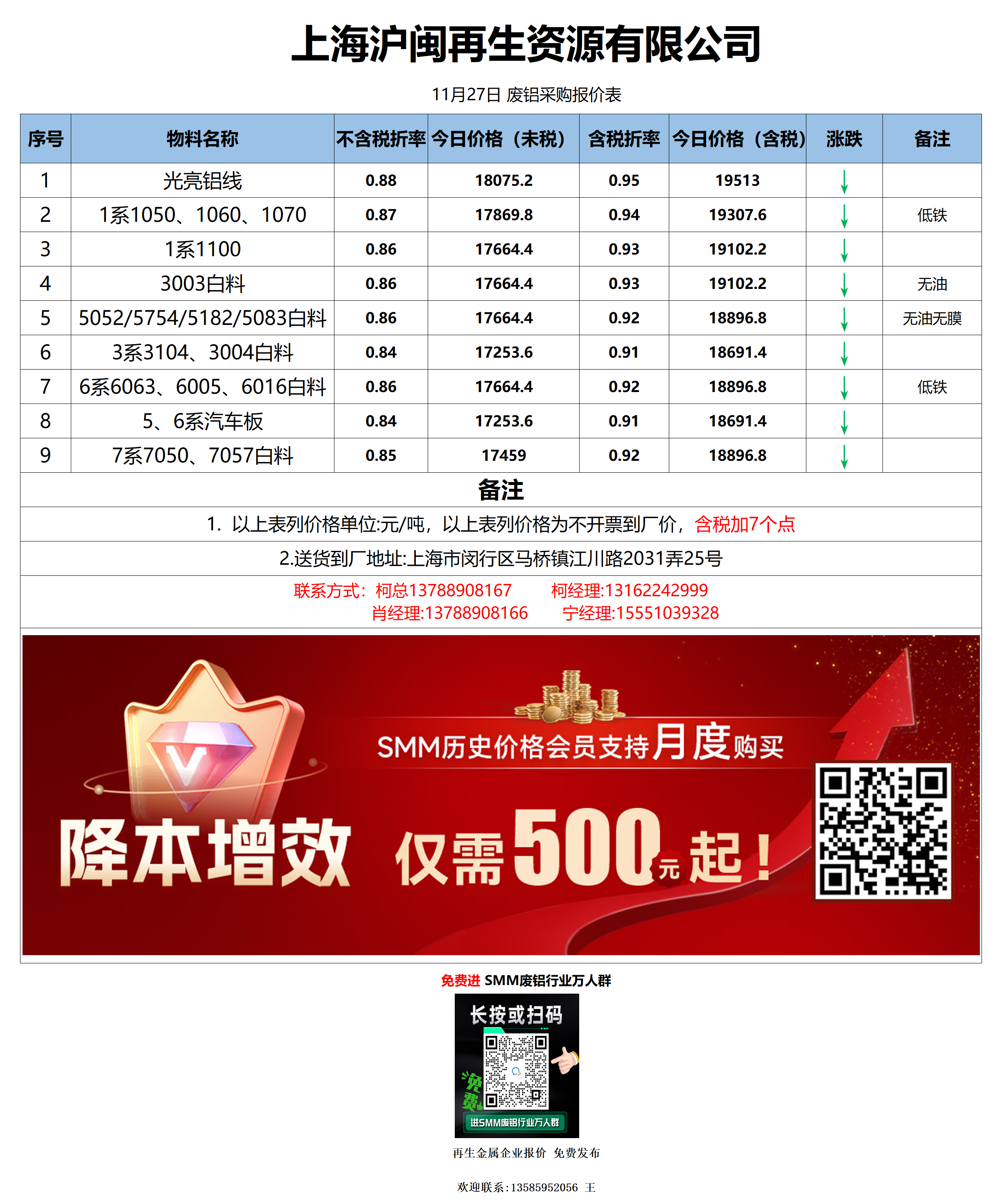 11月27日上海沪闽 废铝采购报价