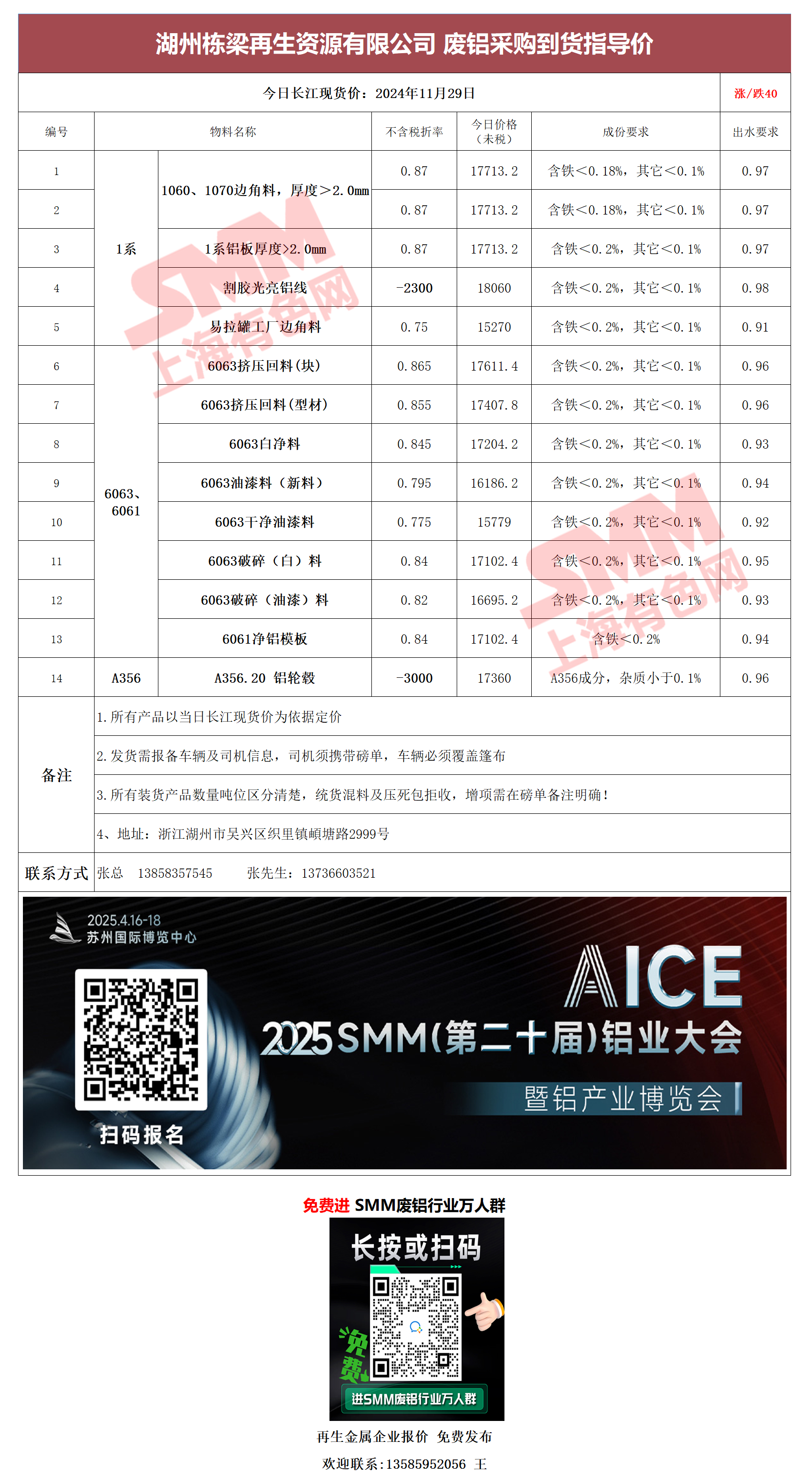 11月29日湖州栋梁再生 废铝采购报价