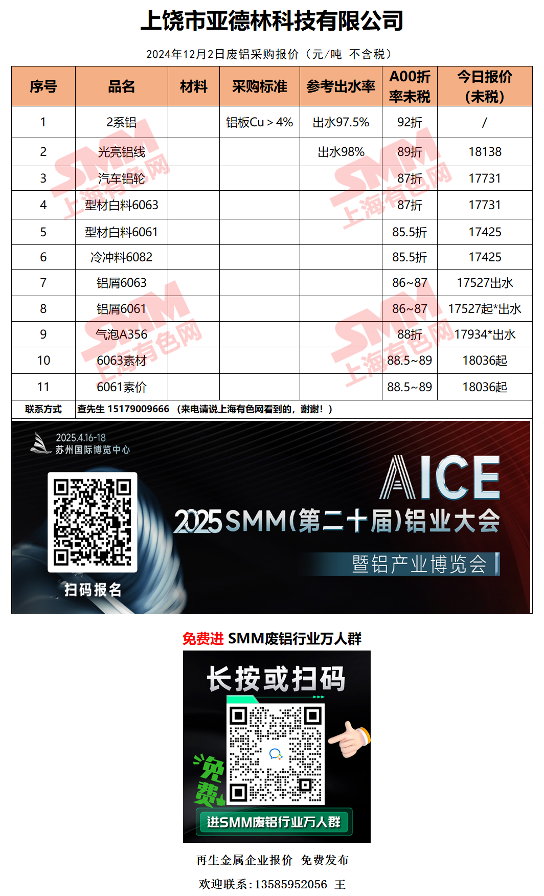 4月3日上海沪闽&福建沪鑫 废铝采购报价