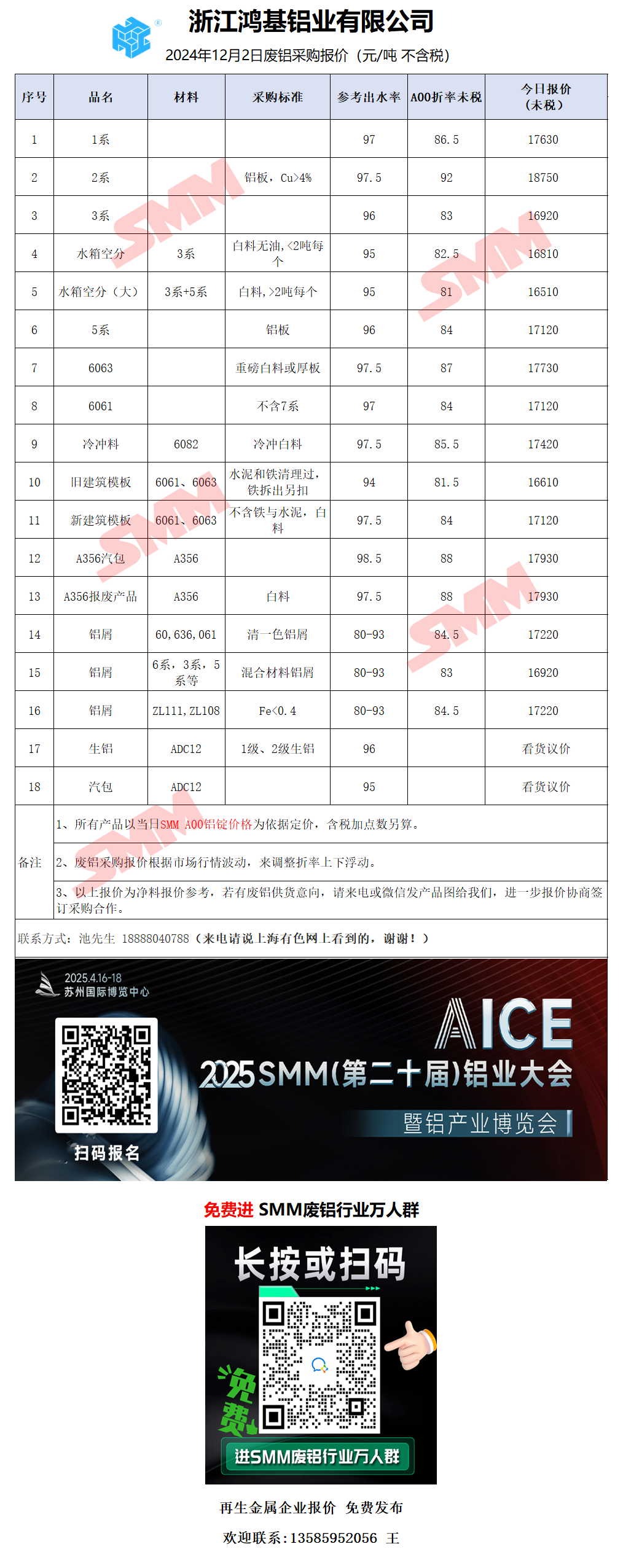 12月2日浙江鸿基铝业 废铝采购报价