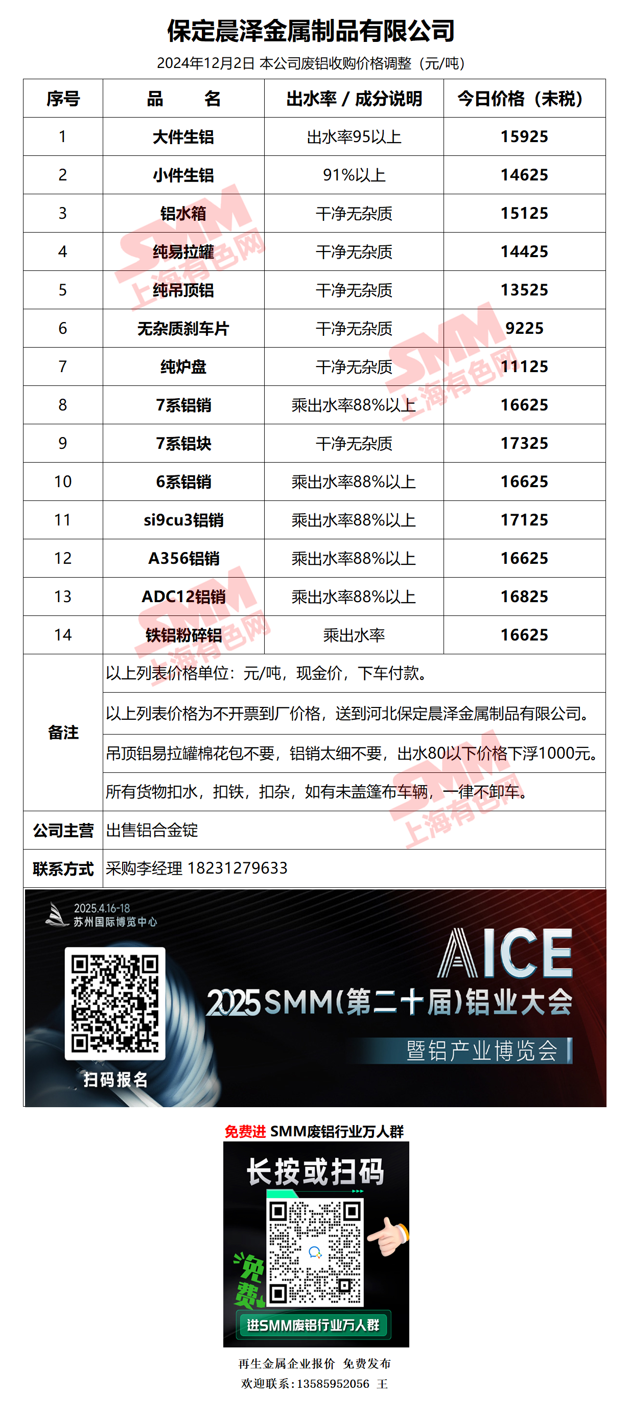 今日保定晨泽 废铝采购报价已更新,有货的朋友欢迎联系我们!