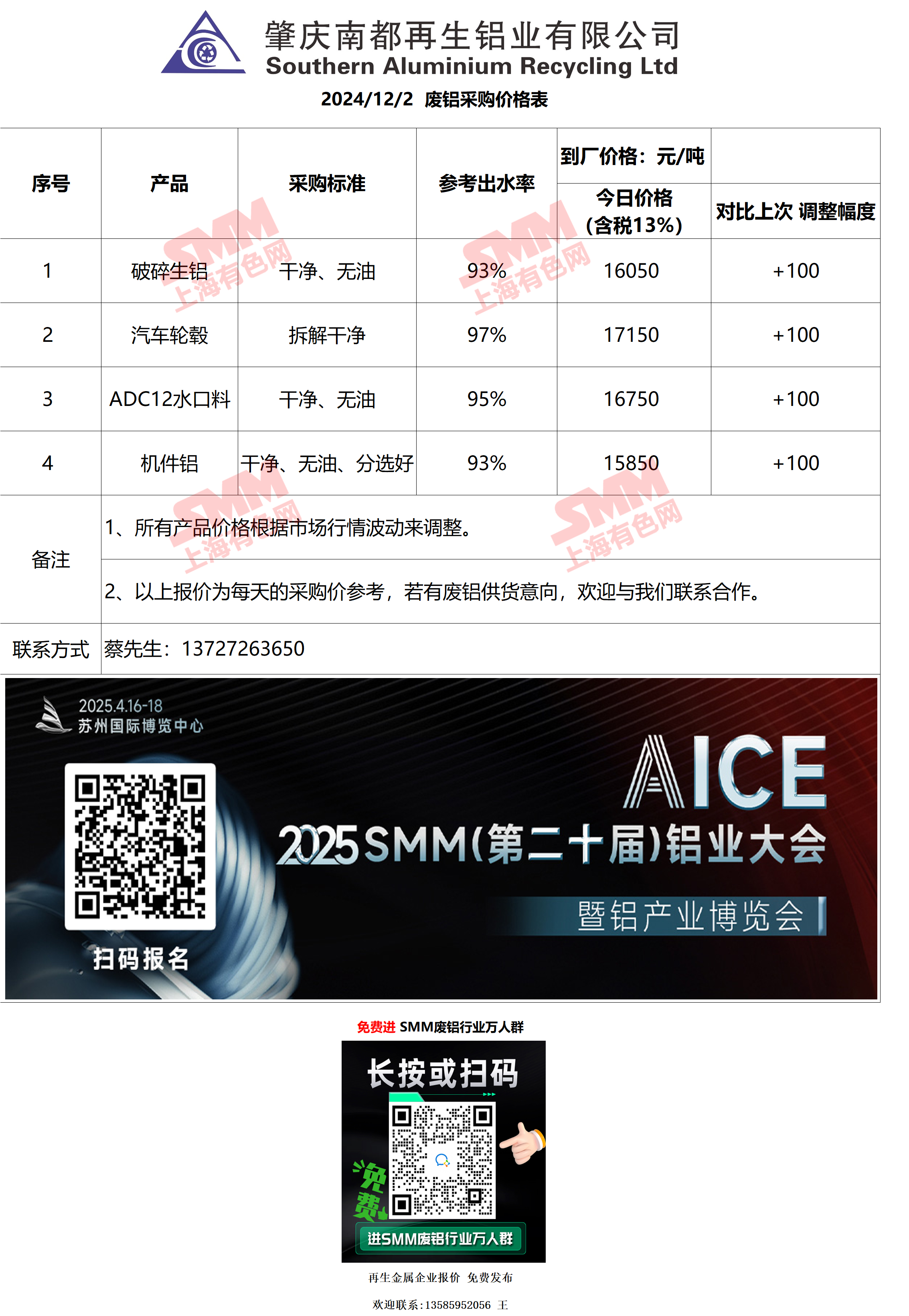 4月3日上海沪闽&福建沪鑫 废铝采购报价