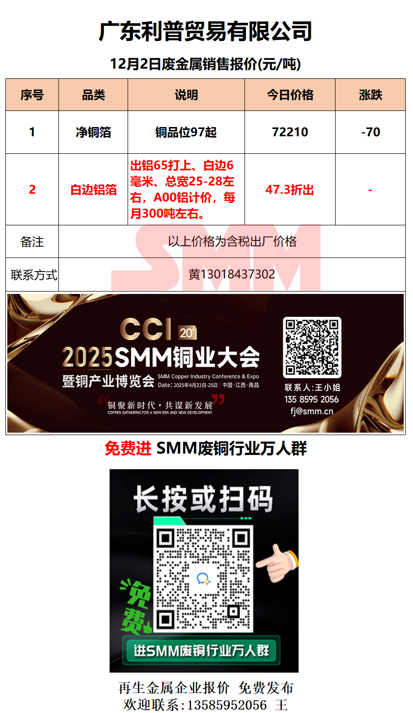 12月2日广东利普 废铜废铝销售报价
