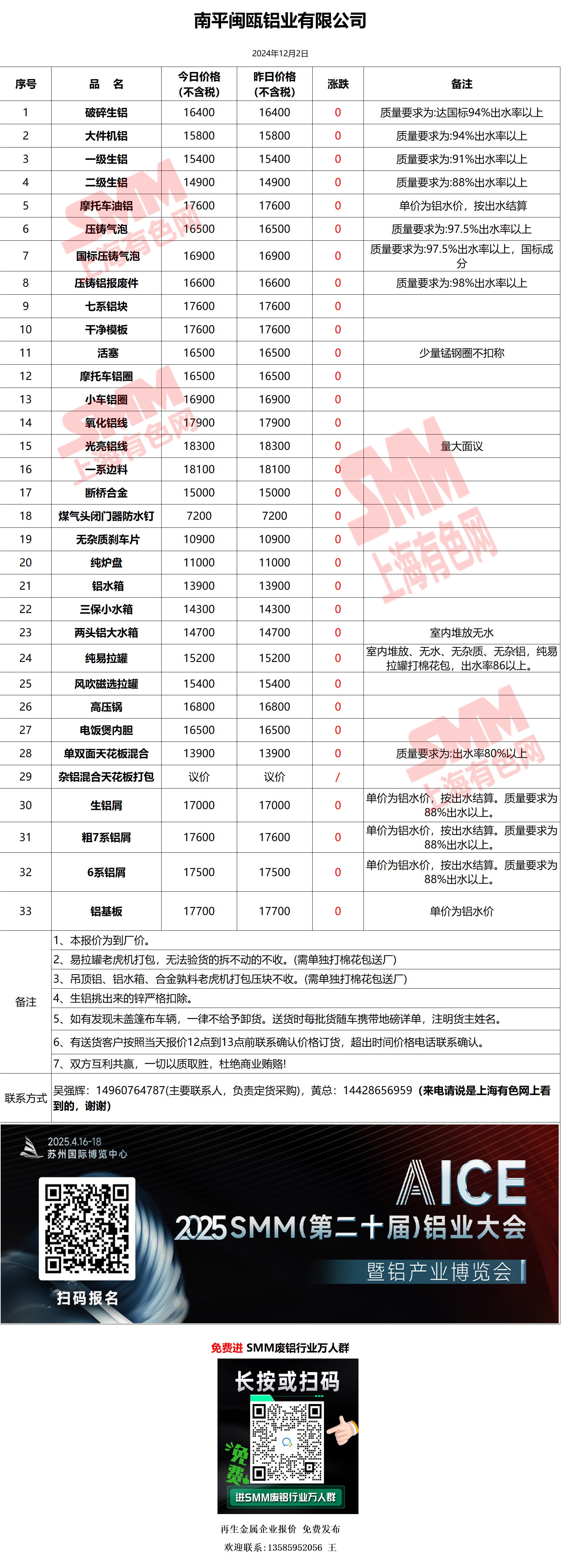 12月2日南平闽瓯 废铝采购报价