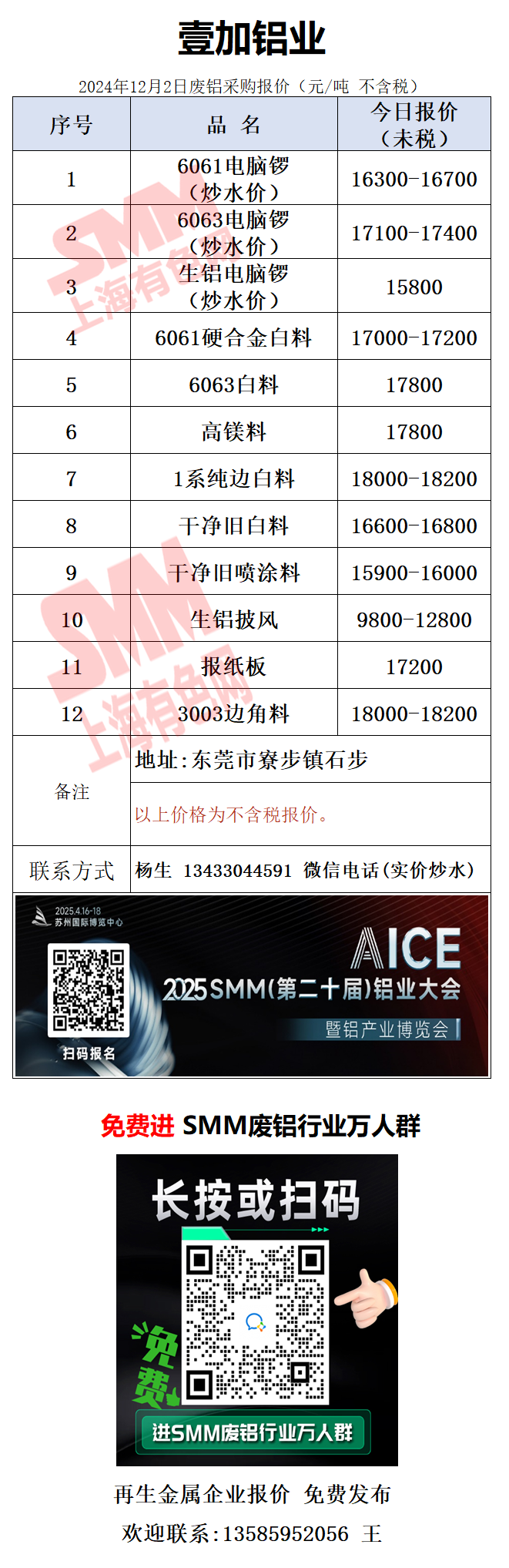 12月2日壹加铝业 废铝采购报价