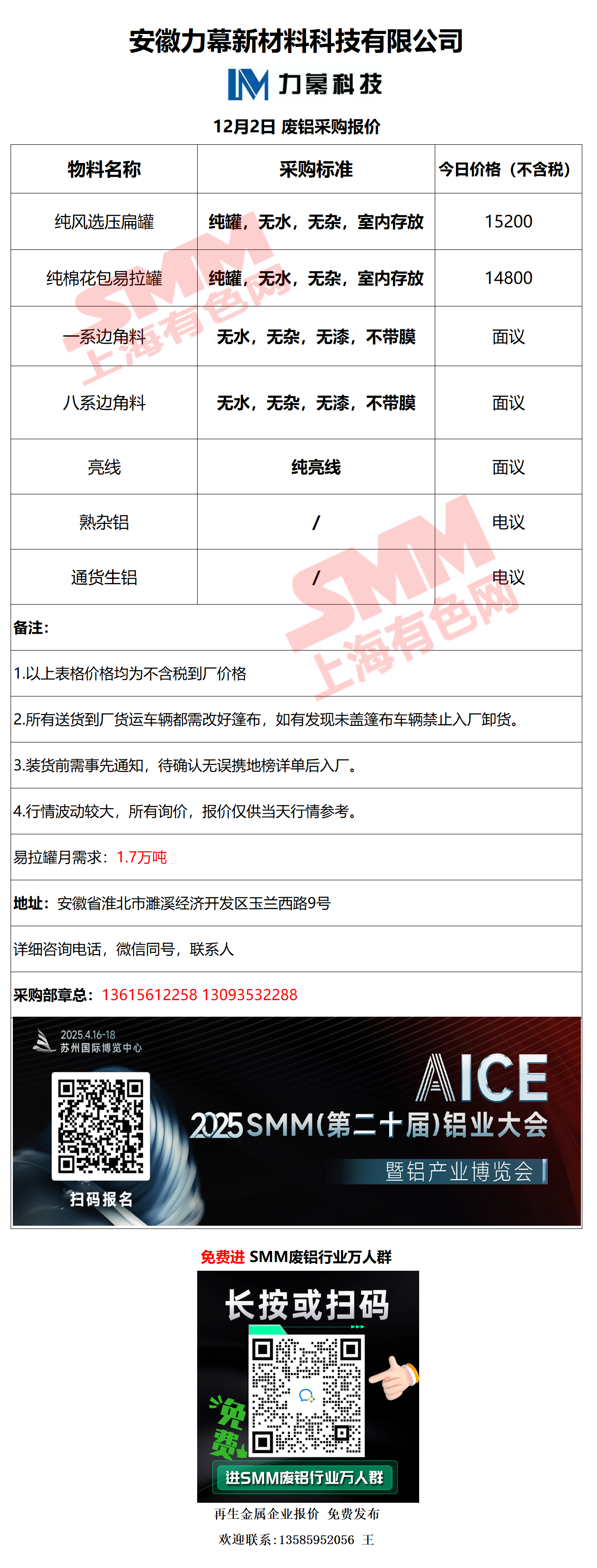 今日安徽力幕 废铝采购报价已更新,有货的朋友欢迎联系我们!