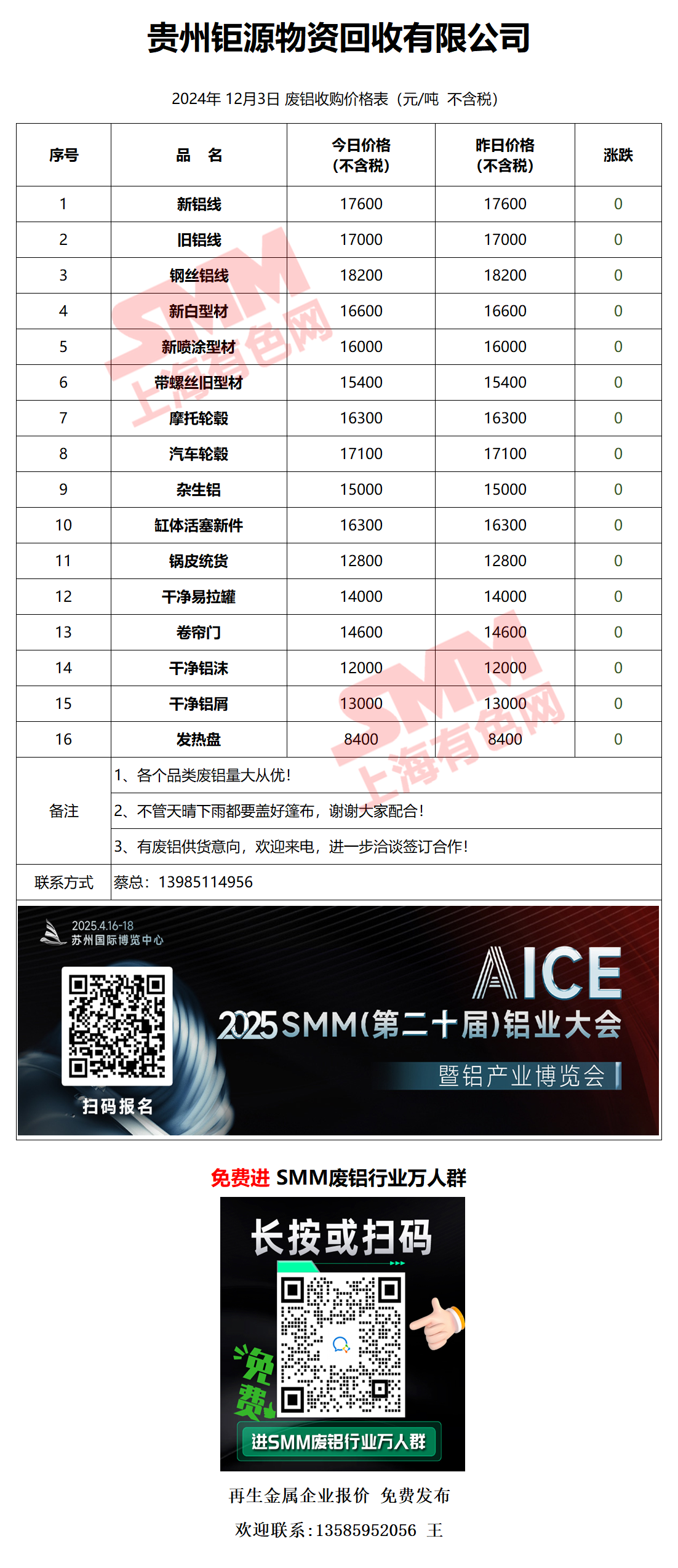 12月3日贵州钜源 废铝采购报价