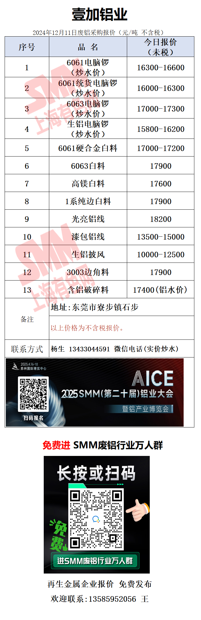 今日壹加铝业 废铝采购报价已更新,有货的朋友欢迎联系我们!