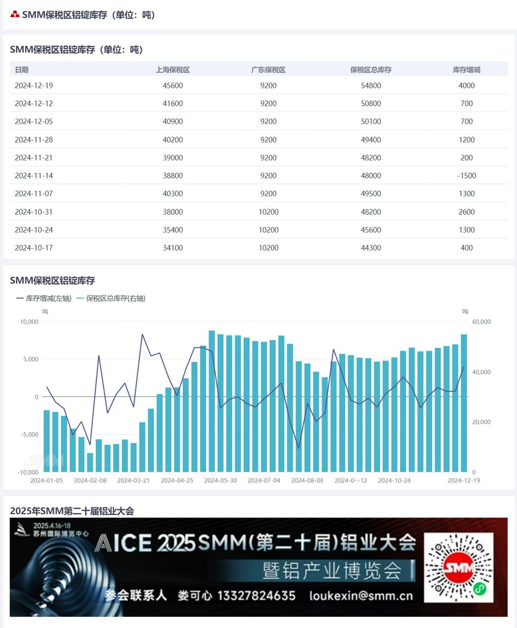 SMM统计: 12月19日,SMM统计上海保税区电解铝库存为45600吨,广东保税区库存9200吨,总计库存54800吨,周度环比增加4000吨。